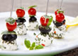 - spiesjes van gemarineerde mozzarella, zwarte olijf, aperitieftomaatjes en blaadjes basilicum.