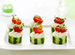 - aperitiefhapjes van schijfjes komkommer afgewerkt met een forel-roomkaascreme en een kerstomaatje op olie.
