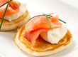 - aperitiefhapjes van blini's, zure room, reepjes gerookte zalm en bieslook.