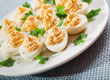 - eitjes gevuld met een smeuïge mengeling van eigeel, mayonaise en dijonmosterd.