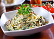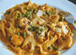 - pasta, gerookte zalm, soepgroenten julienne, room, witte wijn, peper, 1 kl dille.