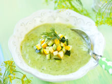 Mix de courgettesoep, breng op smaak met peper en snipper een beetje peterselie in.