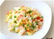 - rijst, erwtjes, bacon, omelet, roze garnalen,...