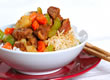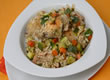 - Rijst met varkensvlees, wortelblokjes, bleekselder en stukjes appel, zacht gekruid met 5 parfum-kruidenmengeling
