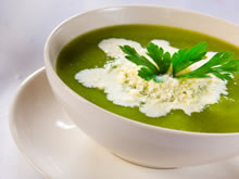 Werk ieder bord slasoep af met een wolkje room en een eetlepel parmezaan.