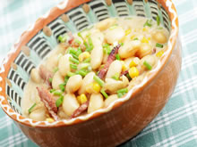 - Recept van bonen met spek en mais, geserveerd in een aardappelsoep.