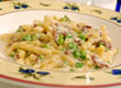 - pasta naar keuze, ontbijtspek, erwtjes, ajuin, room, peper.
