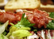 - maaltijdsalade met geitenkaas verpakt in een sneetje ontbijtspek en een dressing op basis van olijfolie, citroensap, honing en peper.