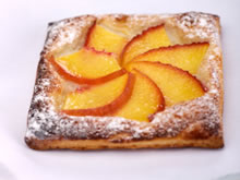 Haal de perziktaartjes uit de oven en bestrijk met abrikozen- of sinaasappelconfituur.
