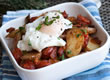 Gebakken aardappelen met chorizo, kerstomaatjes en gepocheerd ei
