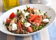 - groene linzen, chorizo, artisjokharten, feta, tomaten, vinaigrette .